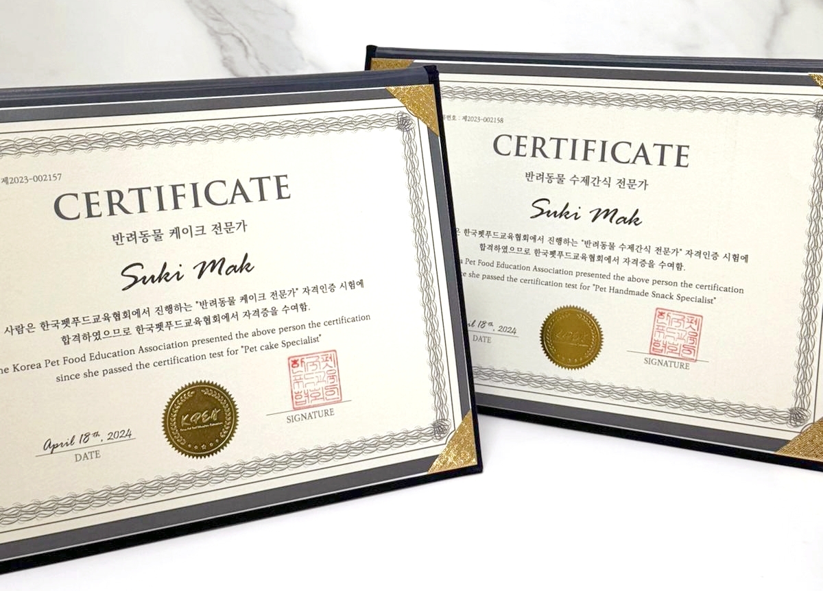 作為獲得韓國政府認可的協會,KPEA所提供的食譜和食材均受到韓國政府的認證。完成整個寵物蛋糕設計課程 (Level 1 至 3)或寵物鮮食及食品專修課程(Level 1 至 2)後,學員將獲得經韓國農林畜產食品部(농림축산식품부)許可和審核的相關證書。